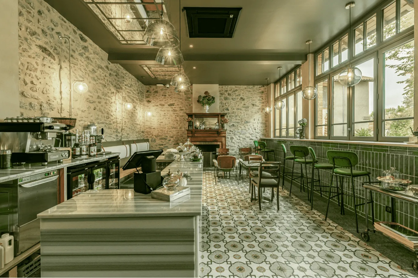 Situé dans un ancien atelier de peinture, le Salon de Thé du Manoir présente une décoration éclectique mêlant le marbre, le terrazzo, le zellige et les anciens murs en pierre, créant une ambiance à la fois élégante et intemporelle. La cheminée en bois, véritable pièce unique, apporte une touche de caractère à cet espace chaleureux.